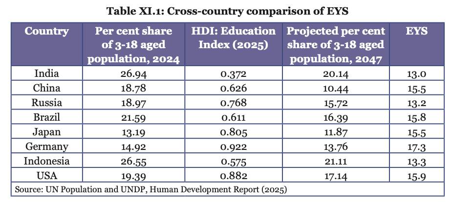 - However, India's Education Index, under UN's Human Development Index (HDI), remains modest, due to relatively low expected years of schooling (EYS) trailing behind global peers.