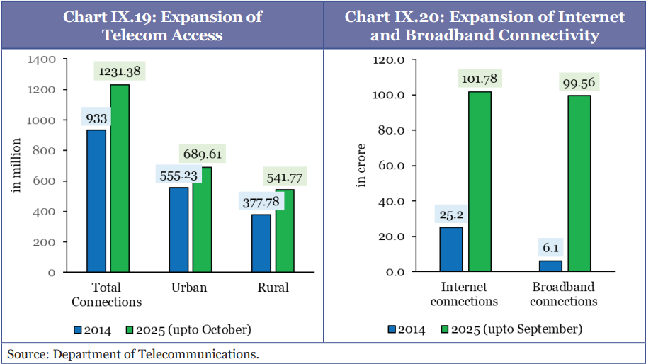 - Expansion of Internet and Broadband Connectivity: Between 2014 and September 2025, internet connections rose from 25.2 crore to 101.78 crore, and broadband connections increased from 6.1 crore to 99.56 crore, indicating rapid expansion in digital access.