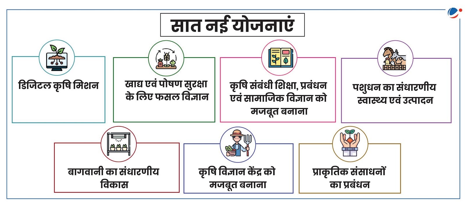 - कृषि विज्ञान केंद्र (KVK) को मजबूत करने से किसानों को गुणवत्तापूर्ण तकनीकी उत्पाद (बीज, रोपण सामग्री, बायो-एजेंट और पशुधन) उपलब्ध होंगे तथा किसानों के जीवन को बेहतर बनाने के लिए फ्रंटलाइन विस्तार गतिविधियों का आयोजन किया जा सकेगा।