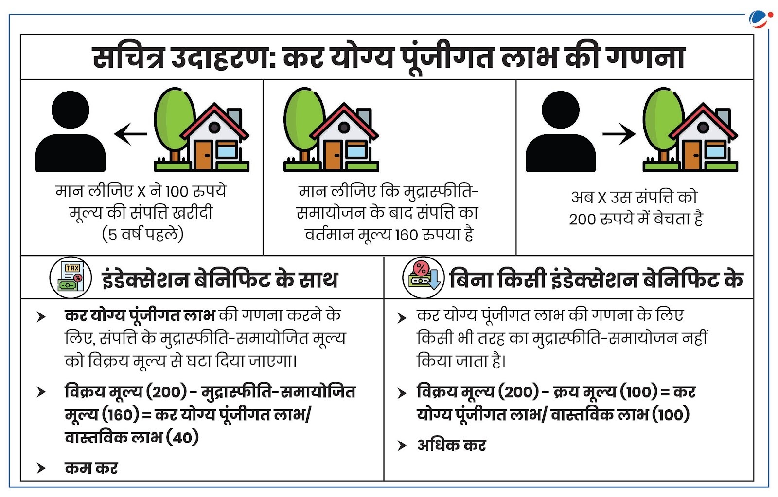 - यह सुनिश्चित करता है कि करदाताओं पर बाजार कीमतों में वृद्धि के कारण उत्पन्न लाभ की बजाए केवल वास्तविक लाभ पर ही कर लगाया जाए। इस प्रकार, संपत्ति की कीमतों में होने वाली सामान्य वृद्धि पर ही कर लगाया जाता है, न कि मुद्रास्फीति जनित वृद्धि पर।