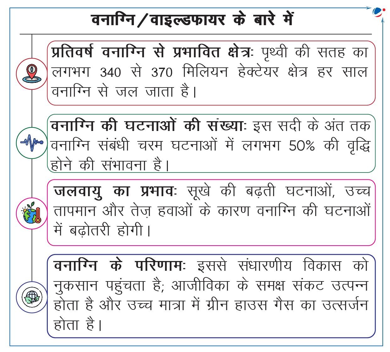 - पर्यावरण: आग लगने की घटनाओं को रोकने या उससे बचाव संबंधी योजना निर्माण एवं प्रबंधन में जलवायु परिवर्तन, वनस्पति और जंगल की आग के पैटर्न के बीच के संबंधों पर विचार करना।