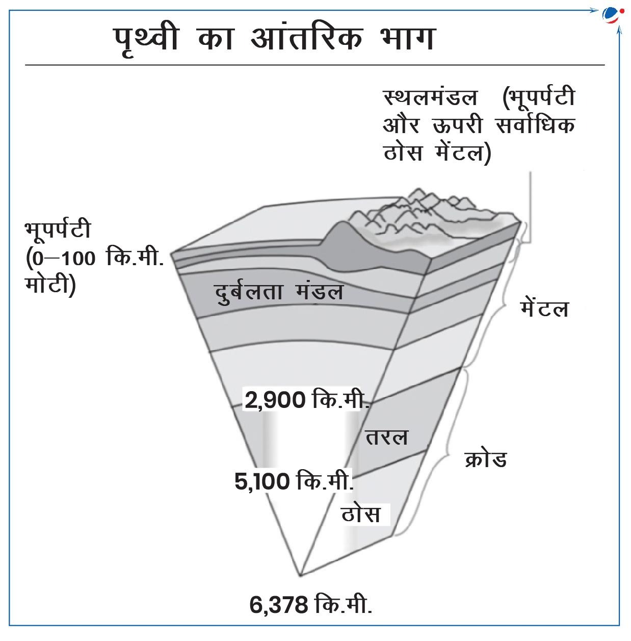 - मेंटल परत सिलिकेट चट्टानों से निर्मित है। यह परत पृथ्वी के आयतन की 80% है। पृथ्वी की आंतरिक संरचना में यह मध्य परत है। यह सबसे ऊपरी परत “भूपर्पटी (क्रस्ट) और सबसे निचली परत ‘कोर’ के बीच स्थित है (इन्फोग्राफिक देखिए)।