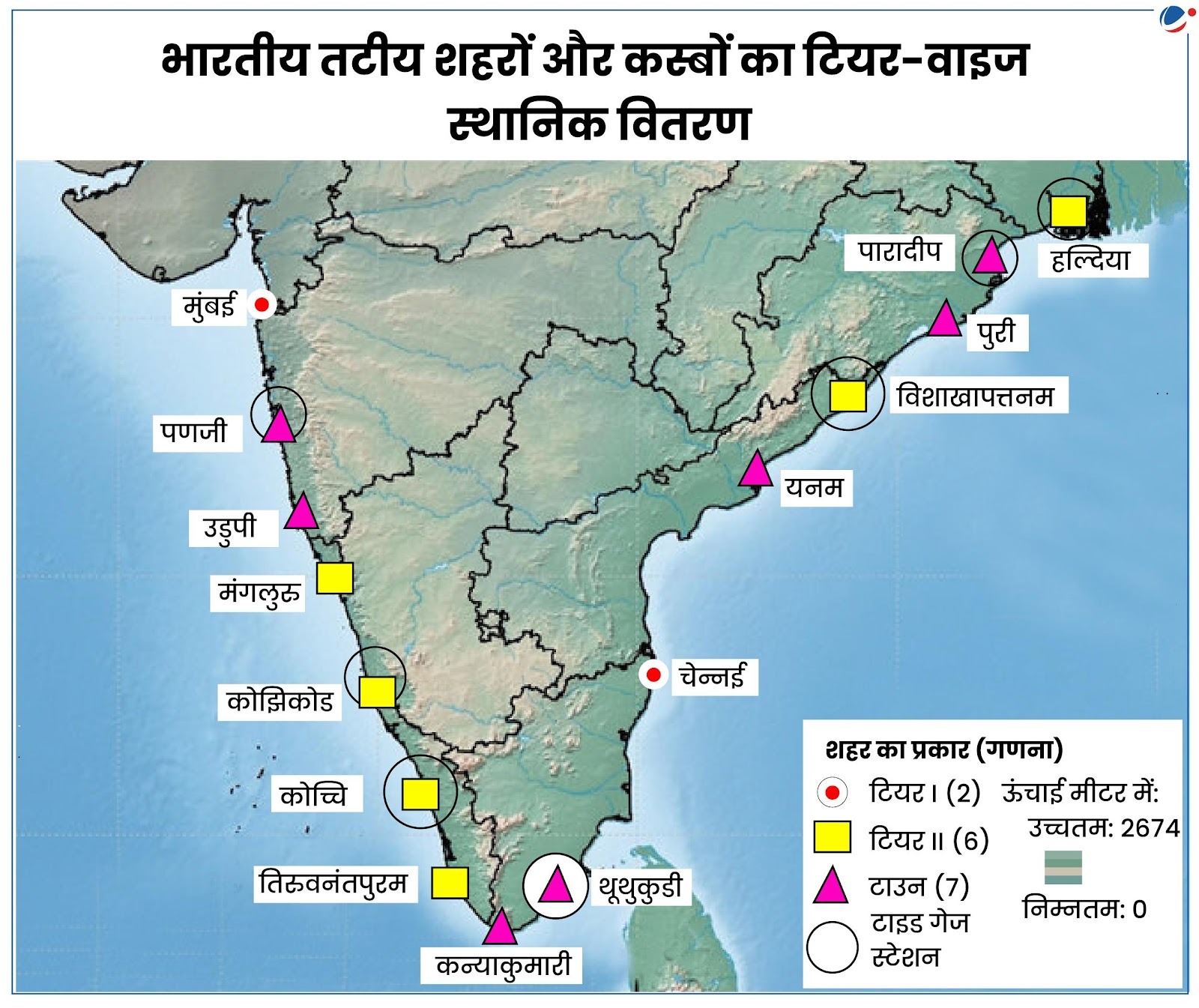 - 2040 तक समुद्र जल स्तर में वृद्धि के कारण जलमग्नता: 2040 तक समुद्री जल स्तर में वृद्धि के कारण मुंबई, यनम और तूथुकुड़ी में 10% से अधिक भूमि; पणजी और चेन्नई में 5%-10% भूमि; और कोच्चि, मंगलूरु, विशाखापत्तनम, हल्दिया, उडुपी, परादीप और पुरी में 1%-5% भूमि जलमग्न हो जाएगी।