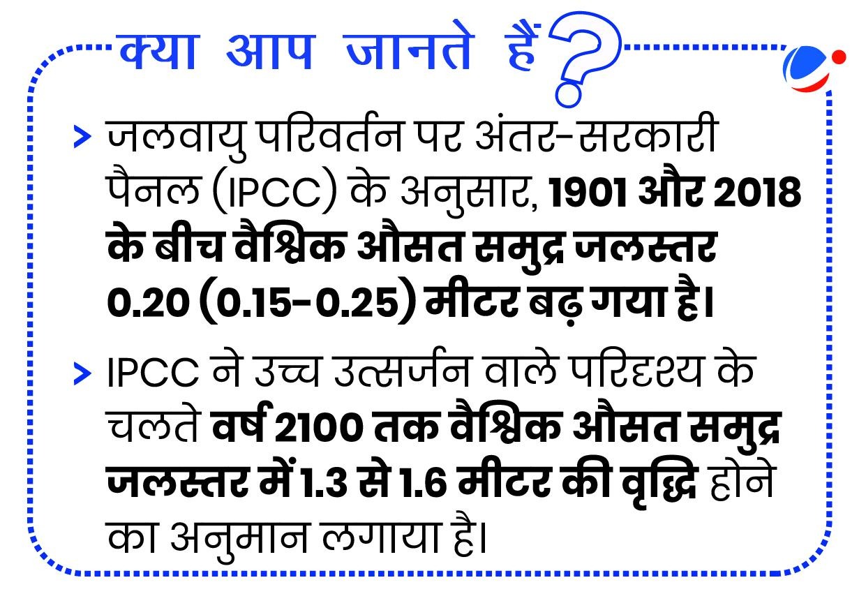 - उदाहरण के लिए- राष्ट्रीय तटीय अनुसंधान केंद्र (NCCR) की रिपोर्ट के अनुसार, 1990 से 2018 के बीच भारत के समुद्र तट का लगभग 32 प्रतिशत हिस्सा समुद्री कटाव से प्रभावित हुआ है।