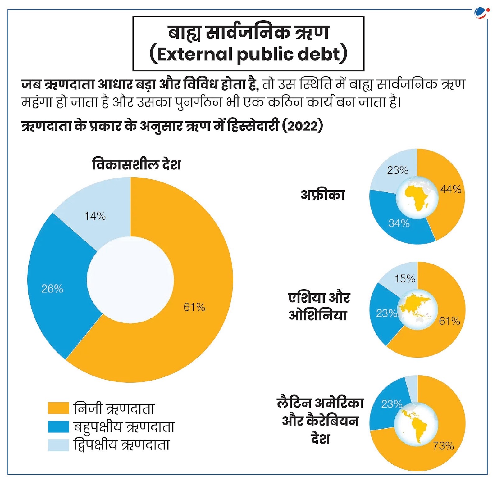 - निजी ऋणदाताओं (बॉण्ड धारक, बैंक और अन्य ऋणदाता) पर अत्यधिक निर्भरता: 2010 के बाद से, निजी ऋणदाताओं द्वारा दिए जाने वाले बाह्य सार्वजनिक ऋण का हिस्सा सभी क्षेत्रों में बढ़ गया है। यह 2022 में विकासशील देशों के कुल बाह्य सार्वजनिक ऋण का 61% था।