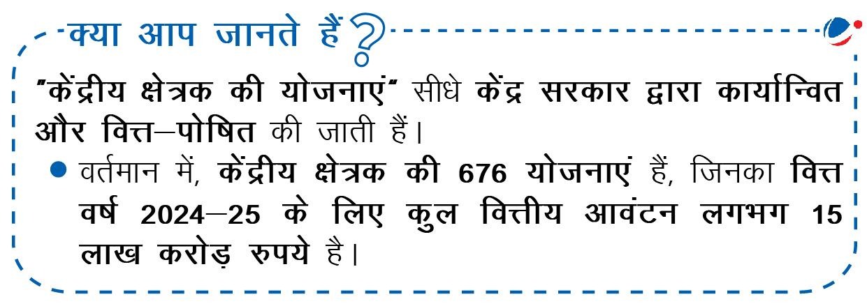 - वर्तमान स्थिति: वर्तमान में 75 केंद्र प्रायोजित योजनाएं (CSSs) चल रही हैं, जिन्हें 3 श्रेणियों में वर्गीकृत किया गया है। केंद्रीय बजट 2024-25 के अनुसार, मौजूदा समय में केंद्र सरकार अपने कुल बजटीय व्यय का लगभग 10.4% वर्तमान में चल रही 75 CSSs पर खर्च करती है।