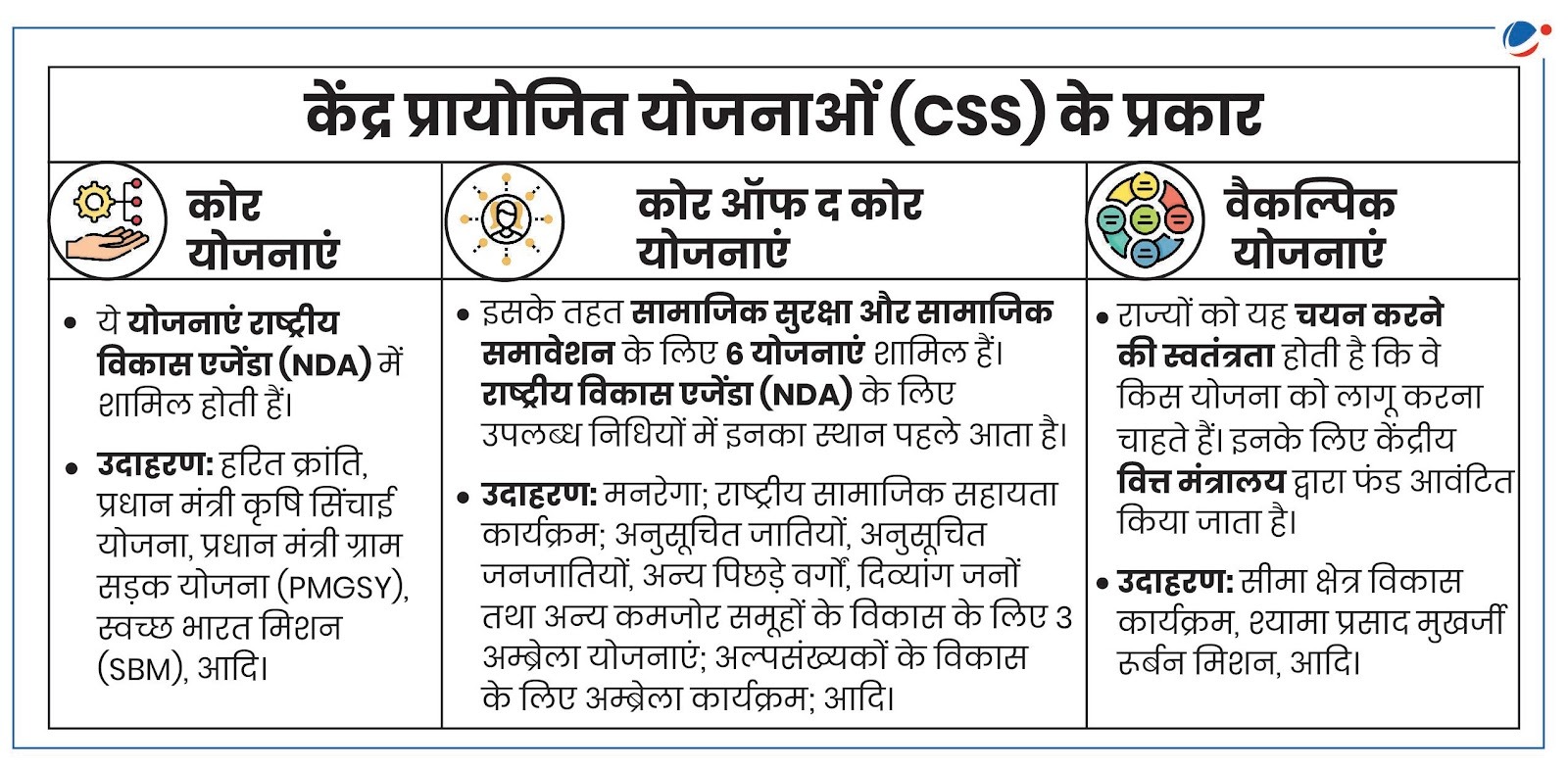 - 14वें वित्त आयोग की सिफारिशों और 2017 से योजना व गैर-योजना भेद को समाप्त करने के बाद, CSSs तथा केंद्रीय क्षेत्रक की योजनाएं (CSs) संघ द्वारा राज्यों को विशेष उद्देश्य हेतु फंड ट्रांसफर का प्राथमिक साधन बन गई हैं।
