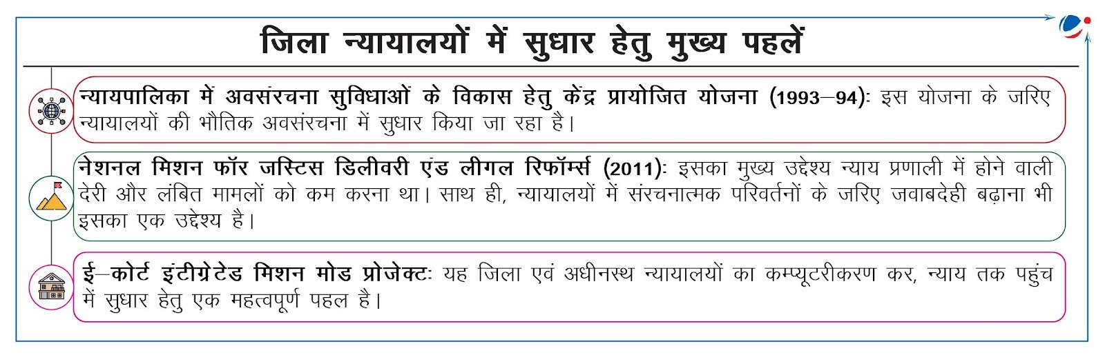 - जिला न्यायालयों से संबंधित अन्य मुद्दे: जिला न्यायालय के सभी विभागों के बीच सहयोग और समन्वय का अभाव है। साथ ही, न्यायालयों में सहायक कर्मचारियों की अस्थायी या कैजुअल नियुक्ति के कारण न्यायिक प्रक्रियाओं में आवश्यक सहयोग में कमी आ रही है।