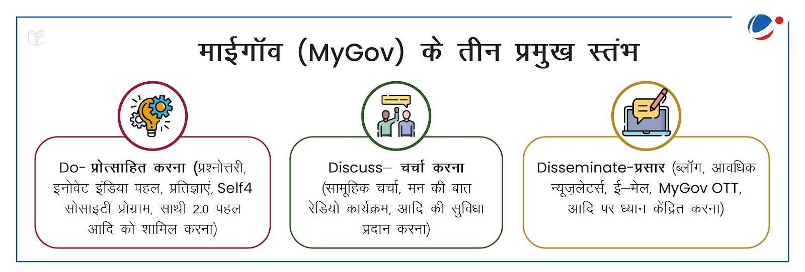 - इस प्लेटफॉर्म को 2014 में भारत के प्रधान मंत्री ने शुरू किया था। MyGov वस्तुतः नागरिकों की भागीदारी हेतु एक प्लेटफॉर्म है, जो नीति निर्माण में नागरिकों की सहभागिता सुनिश्चित करने के लिए कई सरकारी निकायों/ मंत्रालयों के साथ सहयोग करता है। साथ ही, यह प्लेटफॉर्म जनहित तथा लोक कल्याण से जुड़े मुद्दों पर लोगों की राय भी प्राप्त करता है।