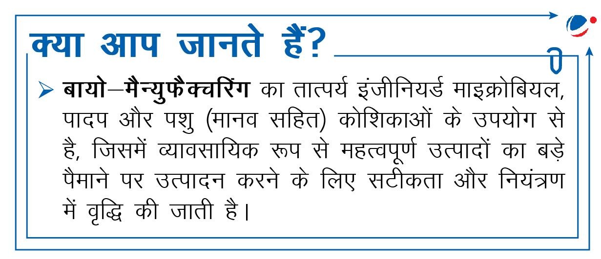 - संयुक्त राज्य अमेरिका से सीखना: अमेरिका ने व्यापक पैमाने पर बायो-मैन्युफैक्चरिंग को विकसित करने के लिए इससे संबंधित स्टार्ट-अप्स में 2 बिलियन डॉलर का निवेश किया है।