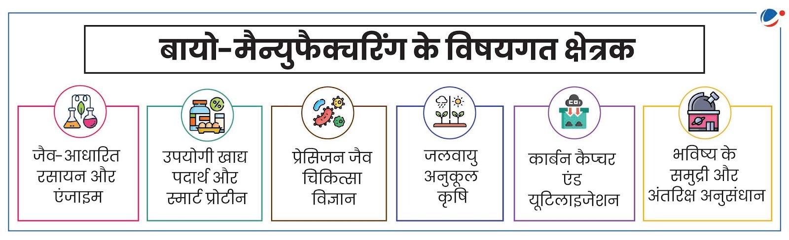 - बायो-मैन्युफैक्चरिंग हब: ये हब शोधकर्ताओं, स्टार्टअप्स और SMEs के लिए प्रायोगिक और पूर्व-व्यावसायिक निर्माण सुविधाओं का साझा उपयोग करेंगे, ताकि प्रारंभिक चरण के विनिर्माण को समर्थन मिल सके।