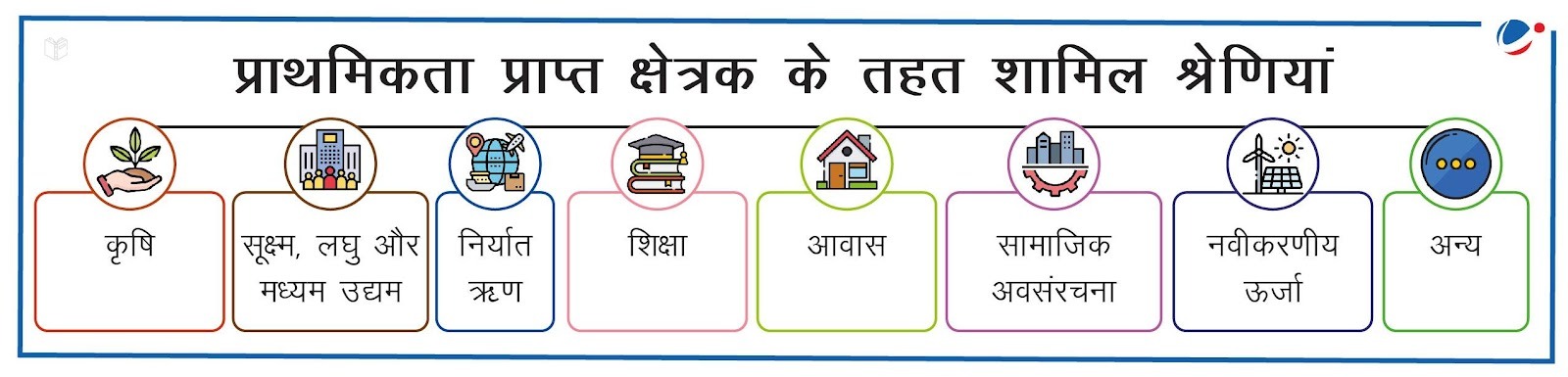 • अनिवार्य लक्ष्य अलग-अलग बैंकों के लिए अलग-अलग है। यह अनुसूचित वाणिज्यिक बैंकों और 20 या अधिक शाखाओं वाले विदेशी बैंकों के लिए 40% है, जबकि क्षेत्रीय ग्रामीण बैंकों तथा लघु वित्त बैंकों के लिए यह 75% है।