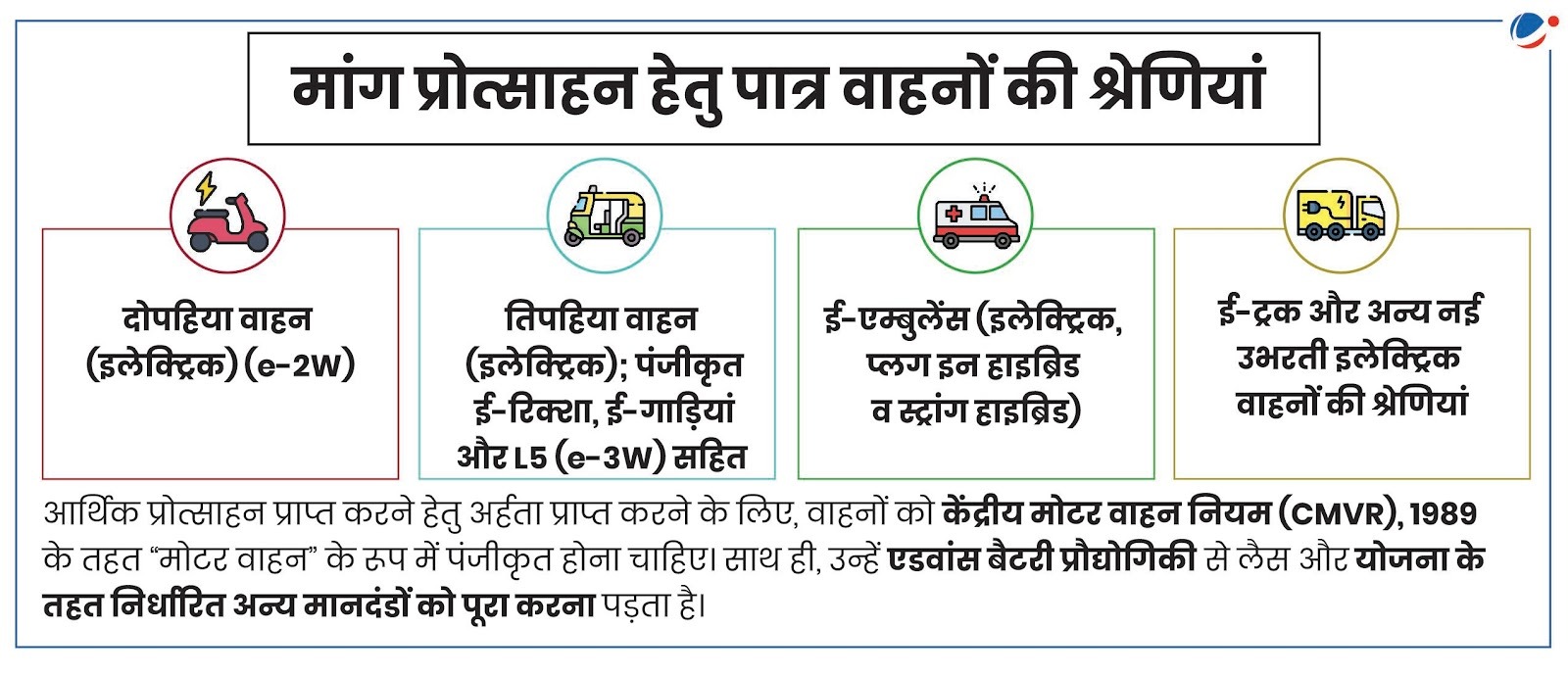 - उद्देश्य: इलेक्ट्रिक वाहनों (EVs) की खरीद पर अग्रिम आर्थिक प्रोत्साहन प्रदान करके ऐसे वाहनों को अपनाने में तेजी लाना, साथ ही EVs के लिए आवश्यक चार्जिंग इंफ्रास्ट्रक्चर की स्थापना की सुविधा प्रदान करना।