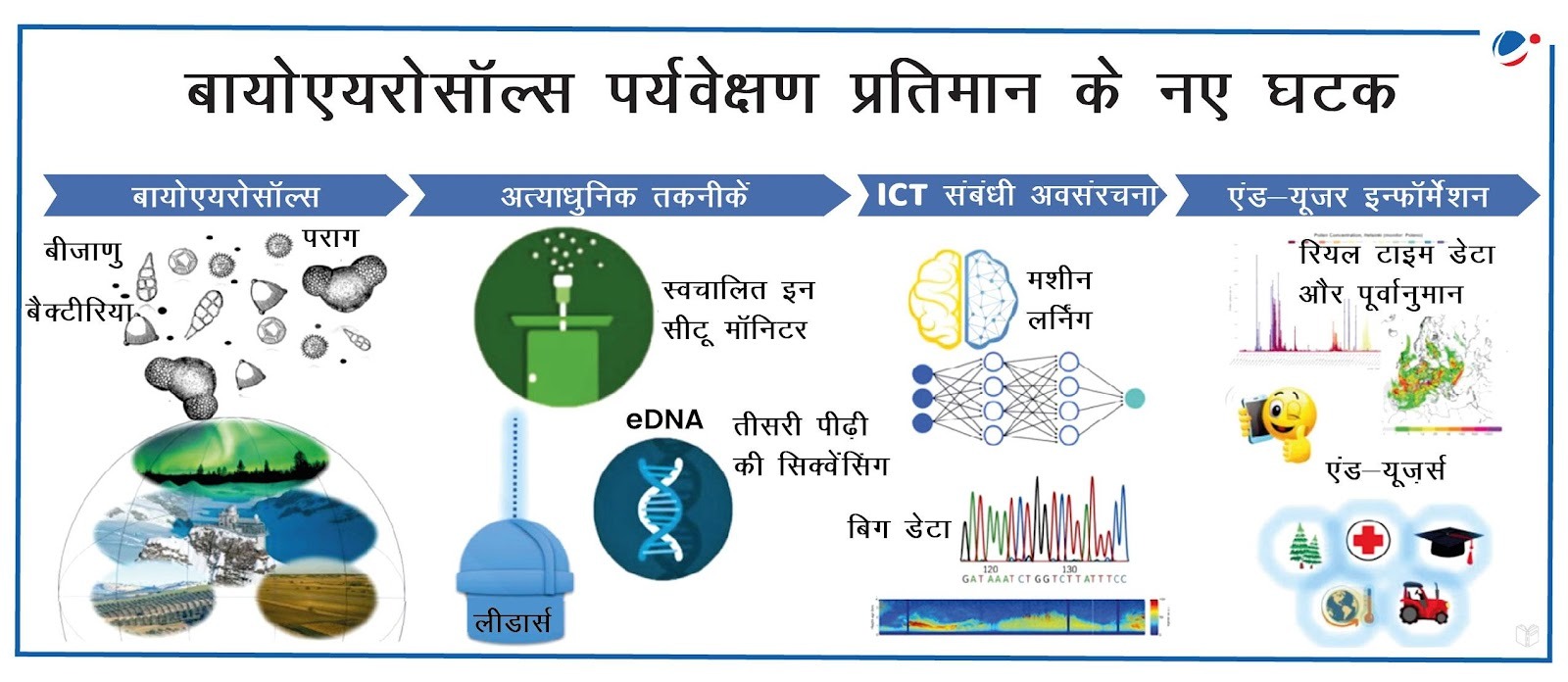 - बायोएयरोसॉल्स पर्यवेक्षण संबंधी नई तकनीकें: इसमें हाई-रिज़ॉल्यूशन इमेज विश्लेषण, होलोग्राफी, मल्टी-बैंड स्कैटरमेट्री, फ्लोरोसेंस स्पेक्ट्रोमेट्री और DNA सीक्वेंसिंग के लिए नैनो तकनीक शामिल हैं।
