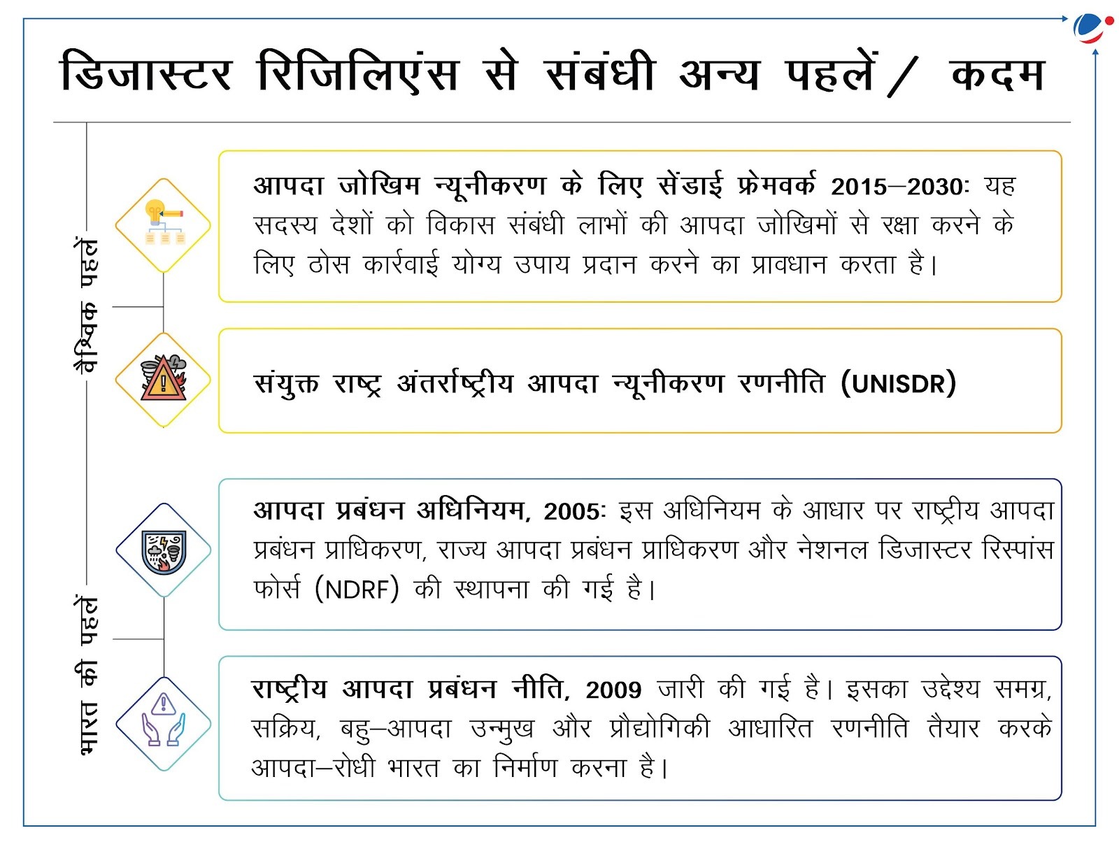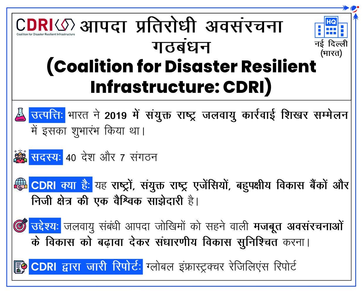 - अंतर्राष्ट्रीय आपदा-रोधी अवसंरचना सम्मेलन (ICDRI): यह आपदा-रोधी चुनौतियों पर चर्चा करने और अच्छी पहलों की पहचान करने के लिए विशेषज्ञों व निर्णयकर्ताओं को एक साथ लाने वाला वार्षिक सम्मेलन है।
