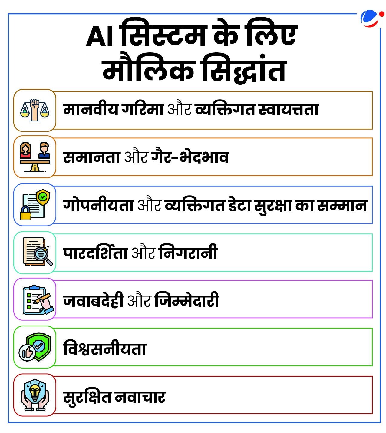 - AI गवर्नेंस के लिए लचीले और विश्व स्तर पर जुड़े ऐसे दृष्टिकोण को अपनाना चाहिए, जो साझा समझ एवं लाभों को बढ़ावा देता है।