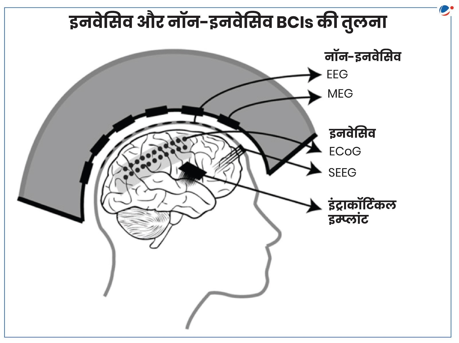 - इनवेसिव BCI (ब्रेन इम्प्लांट्स): इनवेसिव BCI को न्यूरोसर्जरी के जरिए सीधे मस्तिष्क के ग्रे मैटर में प्रत्यारोपित किया जाता है। ये मस्तिष्क गतिविधि को बेहतर रूप में रिकॉर्ड करते हैं।