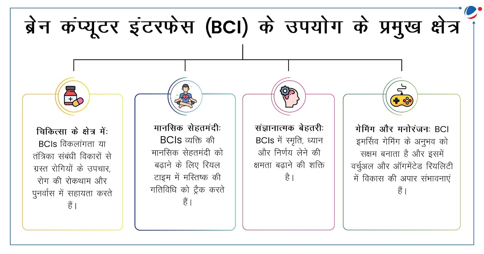 - BCI एक कंप्यूटर-आधारित प्रणाली है। यह मस्तिष्क के संकेतों को प्राप्त करती है, उनका विश्लेषण करती है और उन्हें किसी डिवाइस में भेजे जाने वाले कमांड में तब्दील करती है, ताकि इच्छित कार्य किया जा सके। (नीचे दिए गए इन्फोग्राफिक को देखें)।