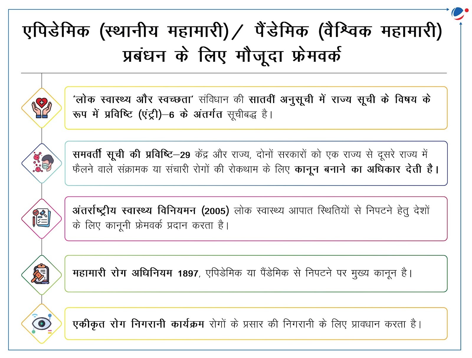 - कानूनी समस्याएं: राष्ट्रीय आपदा प्रबंधन प्राधिकरण (NDMA) और महामारी रोग अधिनियम (EDA) के प्रावधान लोक स्वास्थ्य संबंधी आपातकालीन स्थितियों से निपटने के लिए पूरी तरह से उपयुक्त नहीं हैं।