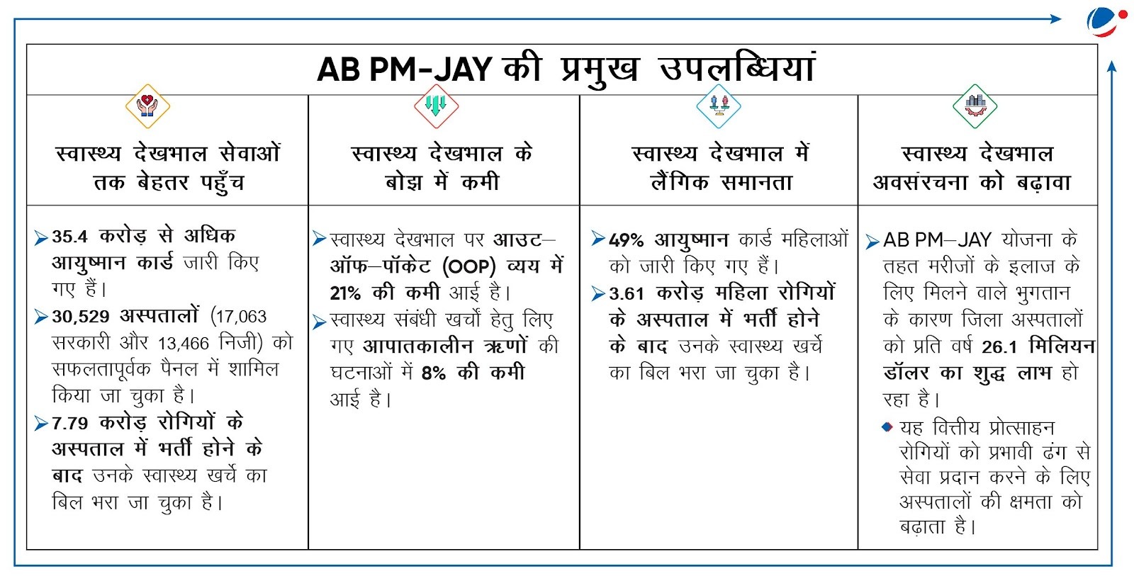 आयुष्मान भारत प्रधान मंत्री जन आरोग्य योजना ने लाखों लोगों को आवश्यक कवरेज प्रदान करके और चिकित्सा व्यय से जुड़े वित्तीय बोझ को कम कर स्वास्थ्य सेवा परिदृश्य को काफ़ी अधिक बदल दिया है। इसके कार्यान्वयन को अक्षरशः सुनिश्चित करने के लिए NHA द्वारा कुशल सत्यापन प्रक्रिया, बेहतर बुनियादी ढांचा, अस्पतालों की जियो-टैगिंग, नियमित सत्यापन जैसे और अधिक सक्रिय कदम उठाने होंगे।