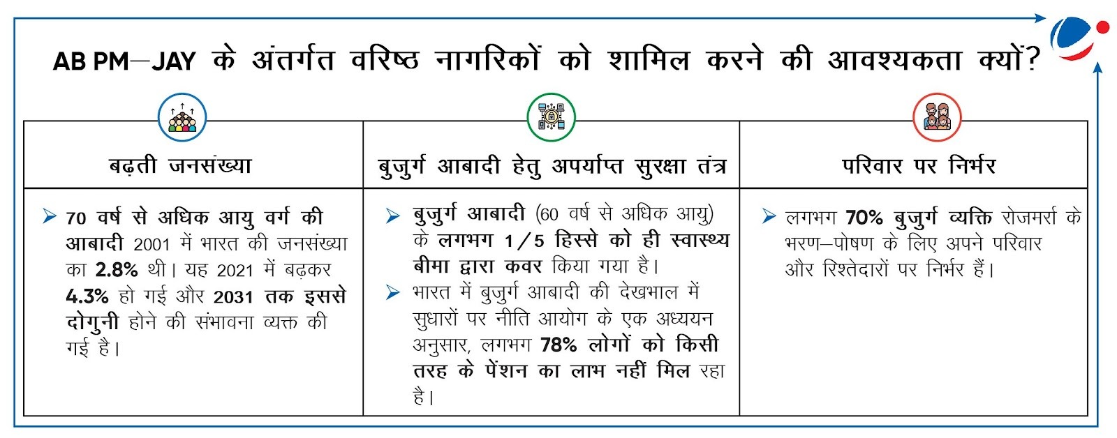 हाल ही में, केंद्रीय मंत्रिमंडल ने आयुष्मान भारत-प्रधान मंत्री जन आरोग्य योजना (AB-PMJAY) के तहत वरिष्ठ नागरिकों के लिए स्वास्थ्य कवर को मंजूरी दी है।