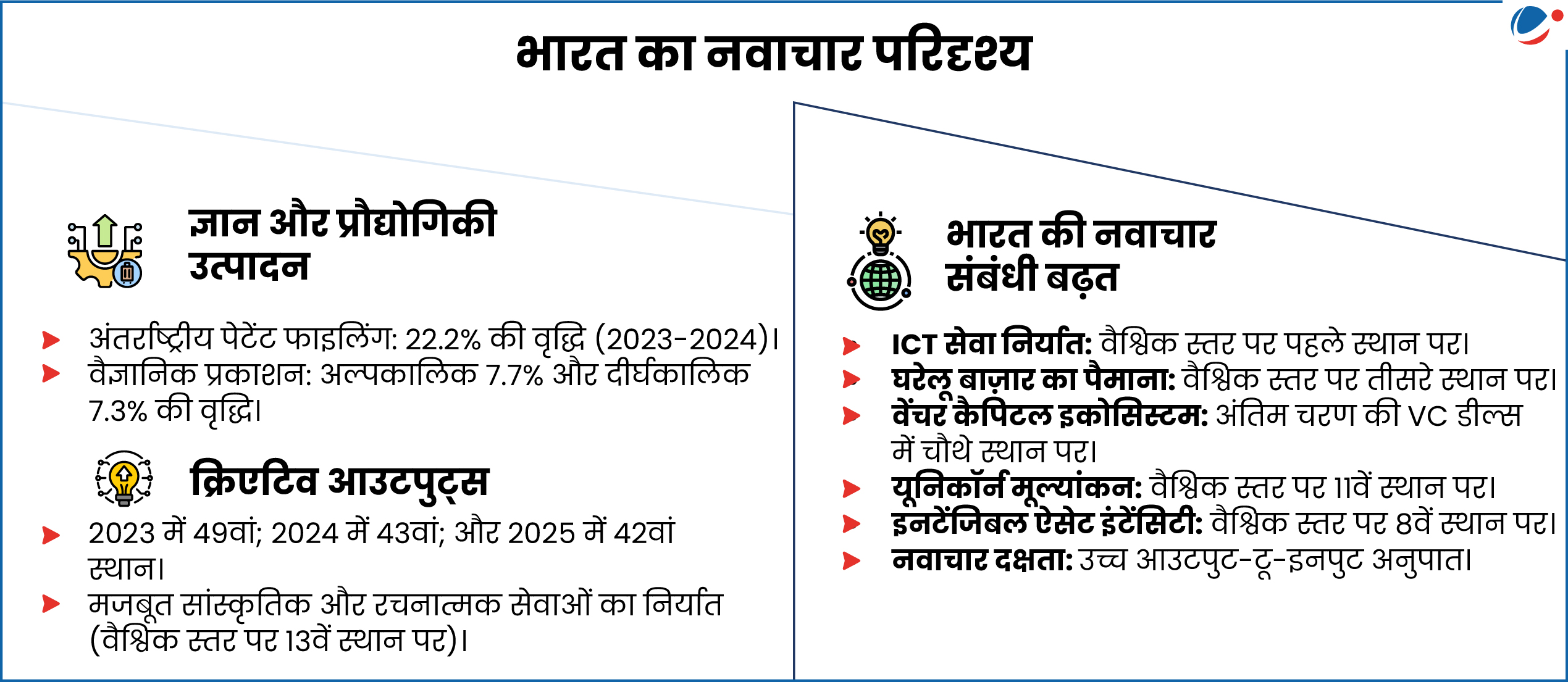 - भारत के चार क्लस्टर्स शीर्ष 100 में हैं: बेंगलुरु (21वाँ), दिल्ली (26वाँ), मुंबई (46वाँ) और चेन्नई (84वाँ)।