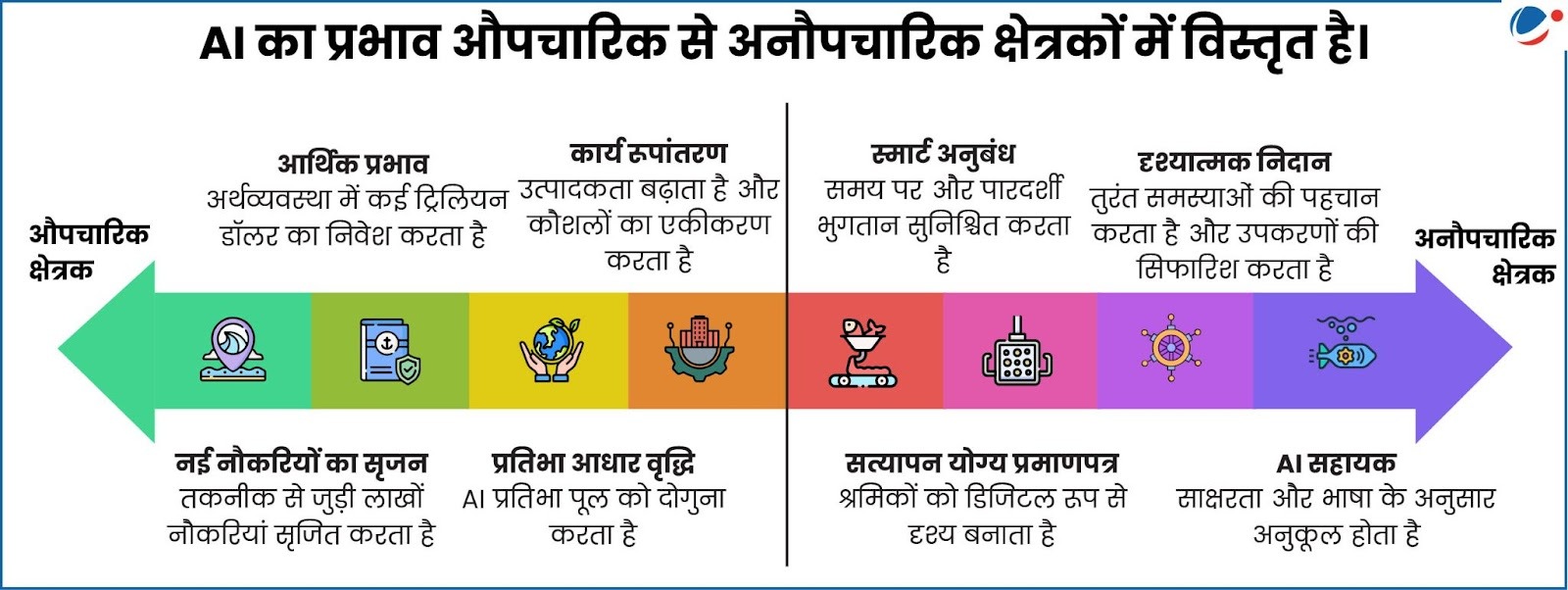 • AI द्वारा भारतीय अर्थव्यवस्था के लिए चुनौती एवं अवसर प्रस्तुत करना: यह पारंपरिक औपचारिक नौकरियों को प्रभावित कर रहा है, वहीं दूसरी ओर यह भारत के विशाल अनौपचारिक कार्यबल को औपचारिक बनाने और उसकी उत्पादकता बढ़ाने का अभूतपूर्व अवसर भी प्रदान करता है।