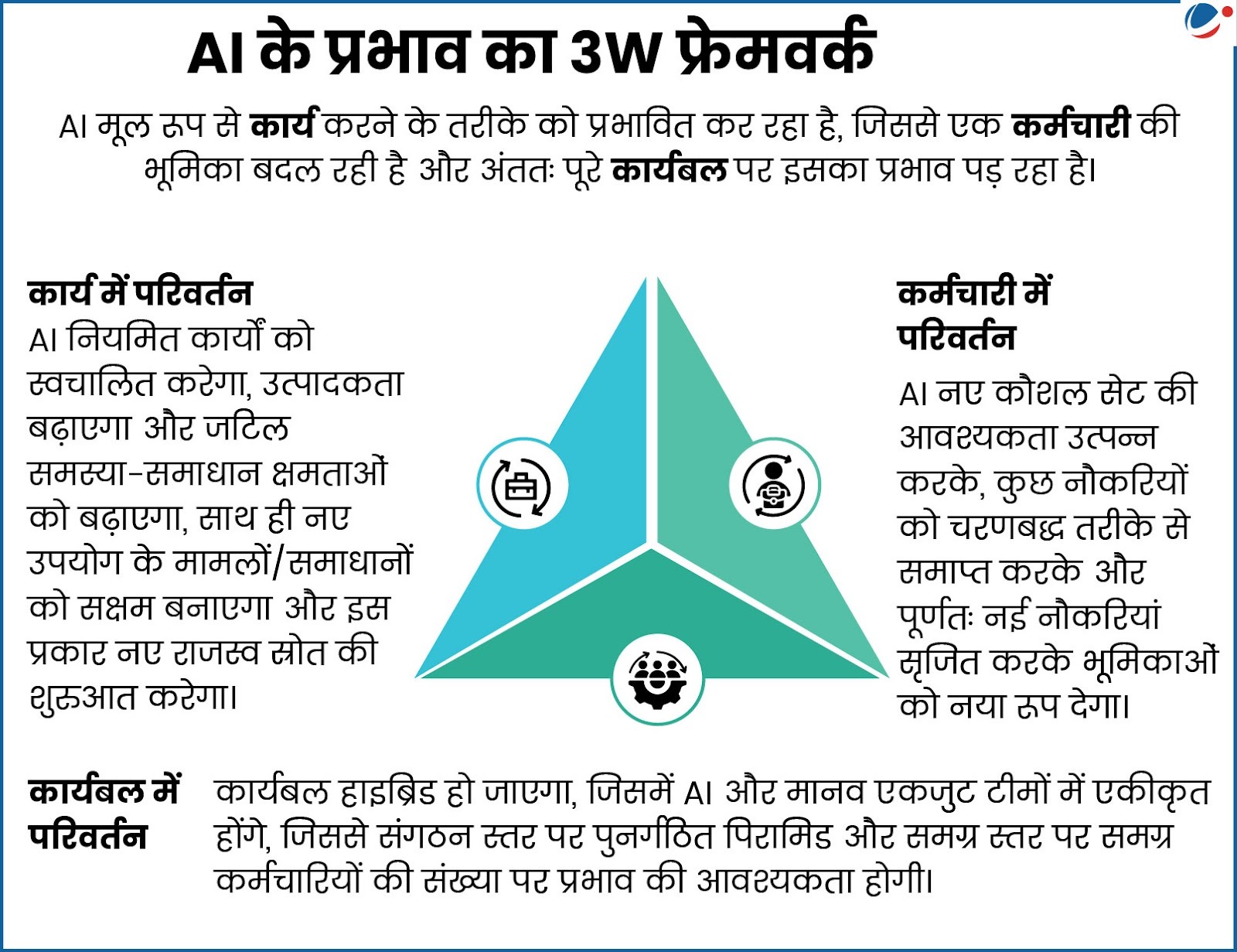 • "AI अर्थव्यवस्था में रोजगार सृजन हेतु रोडमैप": यह रिपोर्ट भारत की रणनीतिक योजना को दर्शाती है ताकि AI से उत्पन्न व्यवधानों का सामना करते हुए देश को वैश्विक AI वर्कफोर्स कैपिटल के रूप में स्थापित किया जा सके। यह AI के लिए 3W फ्रेमवर्क और उससे जुड़े प्रभावों पर प्रकाश डालती है (इन्फोग्राफिक्स देखें)।