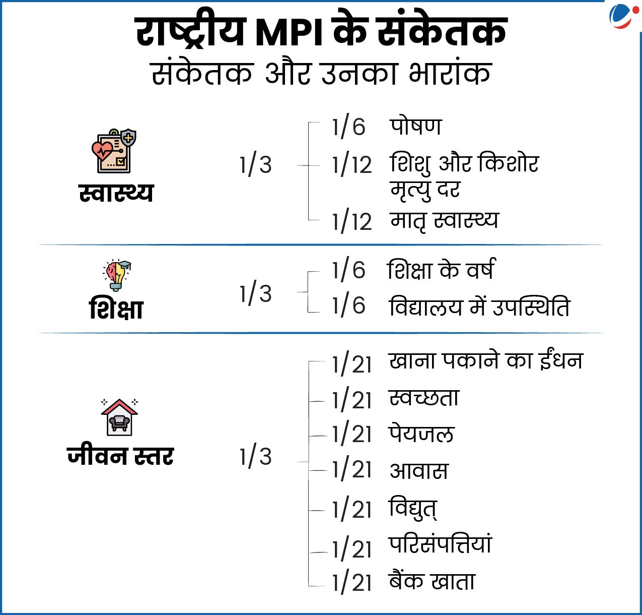 - पद्धति: इस सूचकांक में अंतरराष्ट्रीय स्तर पर मान्यता प्राप्त अल्कायर-फॉस्टर (Alkire-Foster) पद्धति का प्रयोग किया गया है, जो वैश्विक बहुआयामी निर्धनता सूचकांक (वैश्विक MPI) में भी प्रयुक्त होती है। इसमें वैश्विक MPI के सभी 10 संकेतकों यथावत रखा गया है और दो अतिरिक्त संकेतक- मातृ स्वास्थ्य और बैंक खाते को शामिल किया गया है।