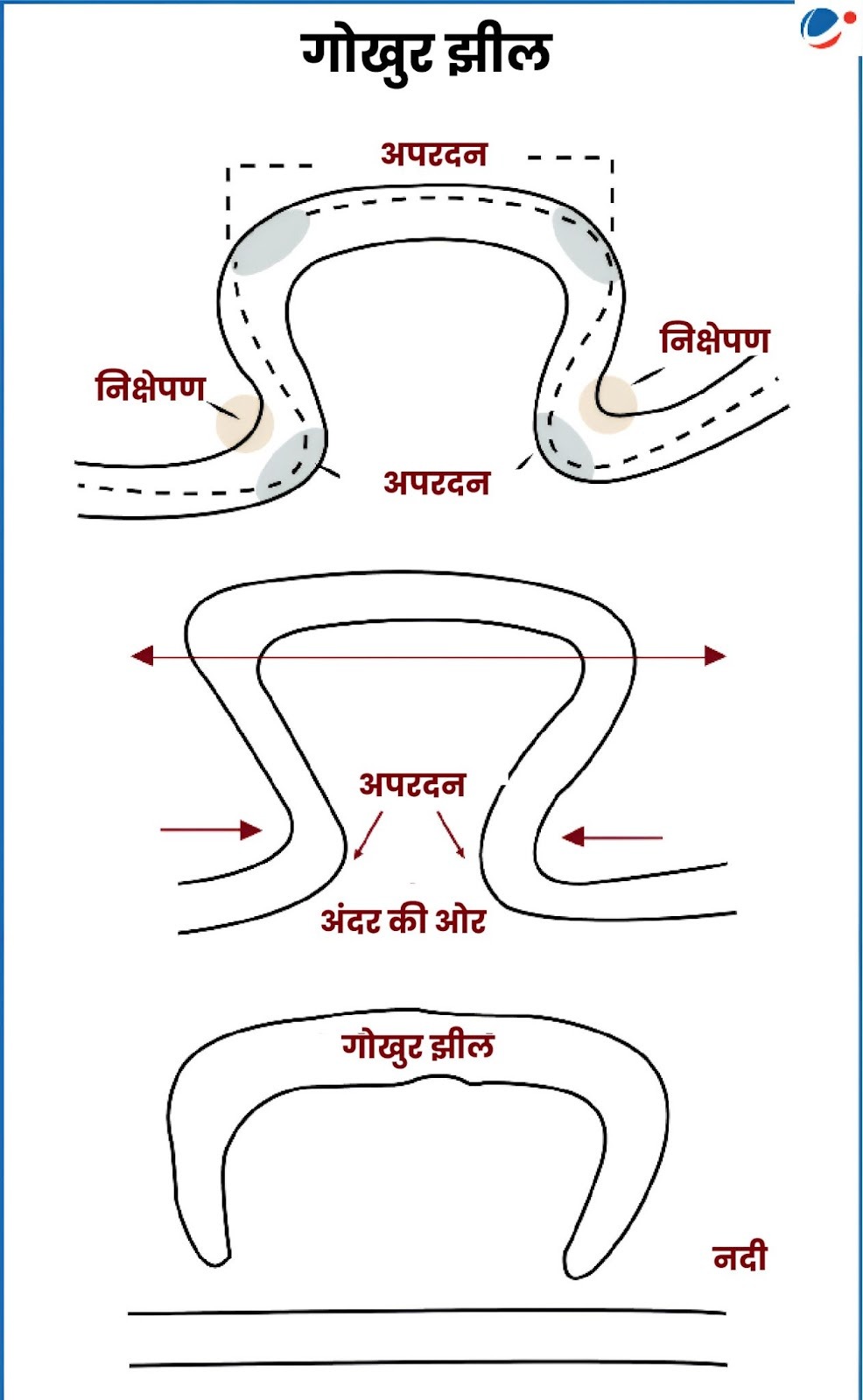 - गोखुर झील अर्धचंद्राकार झील होती है, जो किसी घुमावदार नदी के किनारे निर्मित होती है।