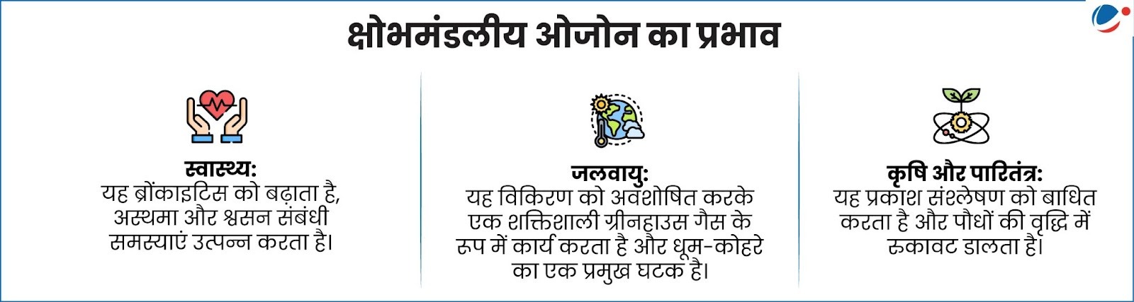 - क्षोमंडलीय ओज़ोन एक द्वितीयक और वायुमंडल में कम समय तक रहने वाला प्रदूषक है। यह वातावरण में केवल कुछ घंटों से लेकर कुछ सप्ताह तक ही मौजूद रहती है।