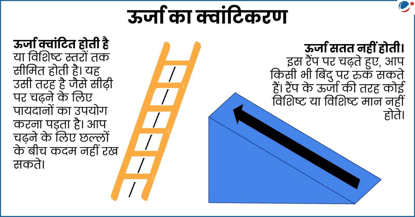 - इसी तरह, परमाणु, इलेक्ट्रॉन और प्रोटॉन जैसे कण केवल कुछ निश्चित ऊर्जा स्तरों में ही मौजूद हो सकते हैं, और उनके बीच में नहीं।