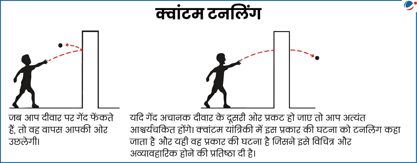 - इसके विपरीत, क्वांटम भौतिकी एक आश्चर्यजनक घटना का खुलासा करती है: जब कोई कण किसी बाधा (संभावित ऊर्जा की दीवार) से टकराता है, तो एक सीमित संभावना मौजूद होती है कि वह बाधा के माध्यम से गुजर सकता है और दूसरी तरफ दिखाई दे सकता है।