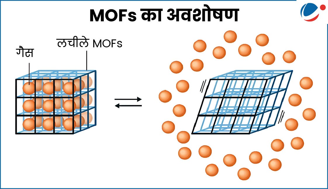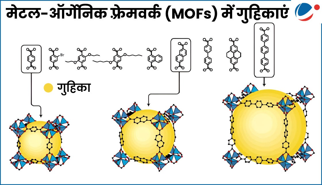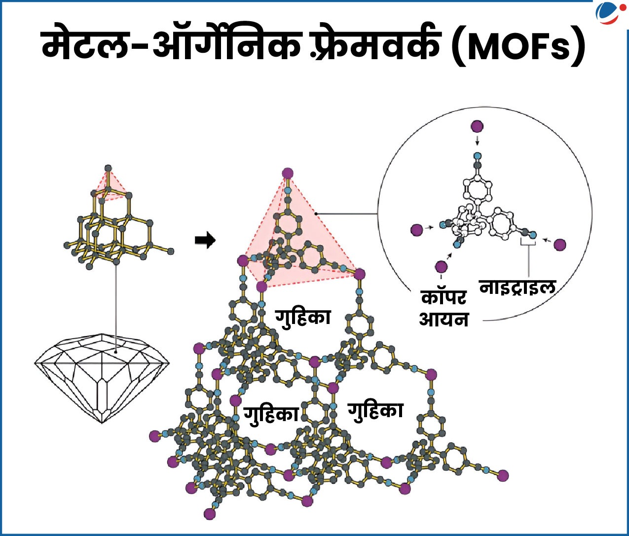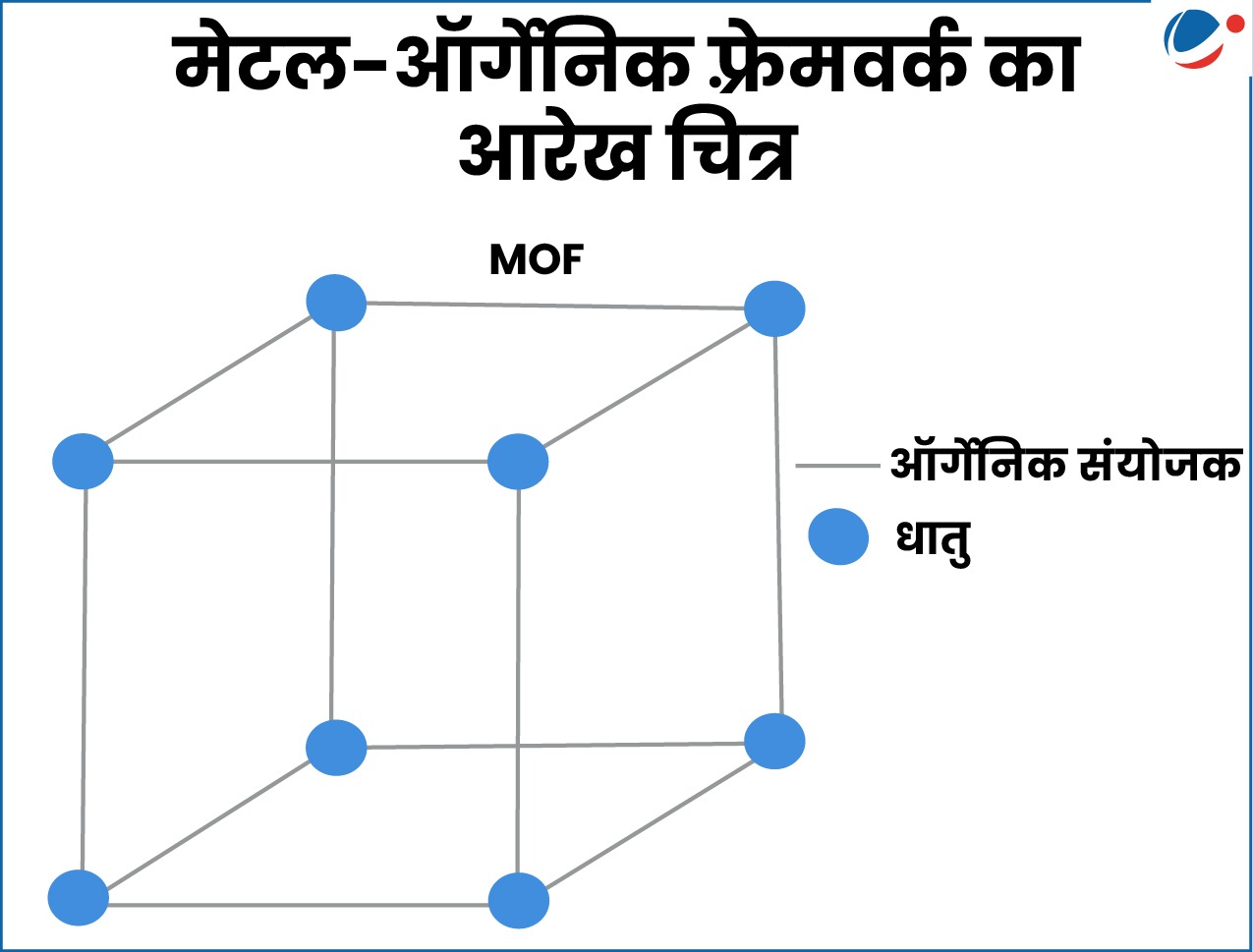 - उदाहरण (इन्फोग्राफिक देखिए): ताँबा धातु (जिसे बिंदु के रूप में दर्शाया गया है) कार्बनिक अणु (जिसे मधुमक्खी के छत्ते जैसी संरचना के रूप में दर्शाया गया है) के साथ मिलकर गुहाओं वाली एक 3D श्रृंखला जैसे फ्रेमवर्क का निर्माण करता है। यह फ्रेमवर्क ही MOF है।