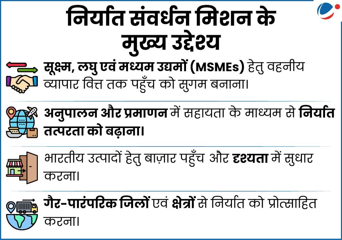 - यह निर्यातकों की बाजार तत्परता और प्रतिस्पर्धात्मकता बढ़ाने जैसी गैर-वित्तीय सक्षमताओं पर केंद्रित है।