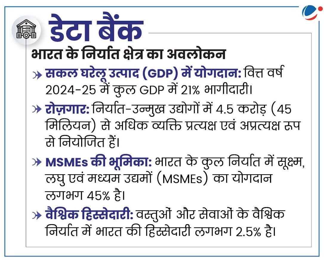 - लक्षित क्षेत्रक: उन क्षेत्रकों को प्राथमिकता से सहायता दी जाएगी, जो हालिया वैश्विक प्रशुल्क (टैरिफ वृद्धि) से प्रभावित हैं। इसमें कपड़ा, चमड़ा, रत्न और आभूषण, इंजीनियरिंग सामान और समुद्री उत्पाद जैसे क्षेत्रक शामिल हैं।
