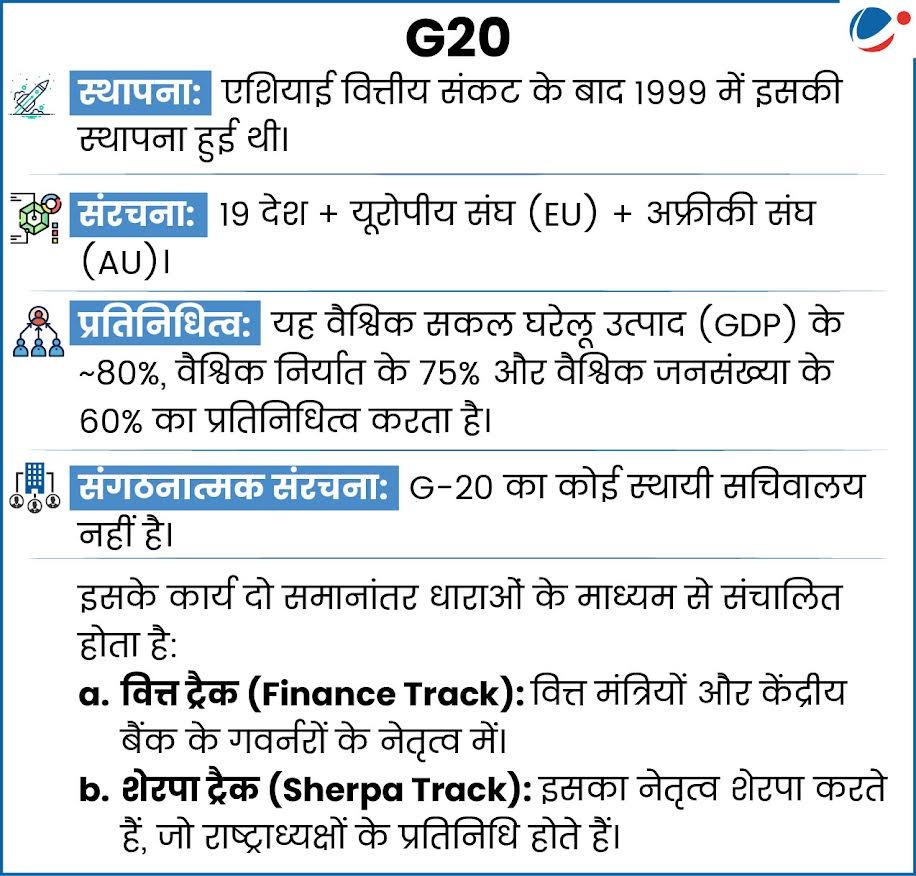 - बहुपक्षीय सुधार का प्रेरक: यह प्रमुख अंतरराष्ट्रीय संस्थानों, विशेष रूप से IMF, विश्व बैंक और WTO के सुधार एजेंडे को आगे बढ़ाने के लिए एक शक्तिशाली सामूहिक आवाज के रूप में कार्य करता है।