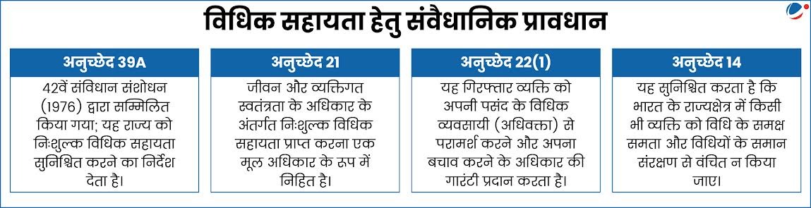 नोट: निःशुल्क विधिक सेवाओं में लाभार्थियों को केंद्र या राज्य सरकार की कल्याणकारी योजनाओं तक पहुंच बनाने में सहायता और परामर्श प्रदान करना भी शामिल है, ताकि उनकी न्याय तक समग्र पहुंच सुनिश्चित की जा सके।