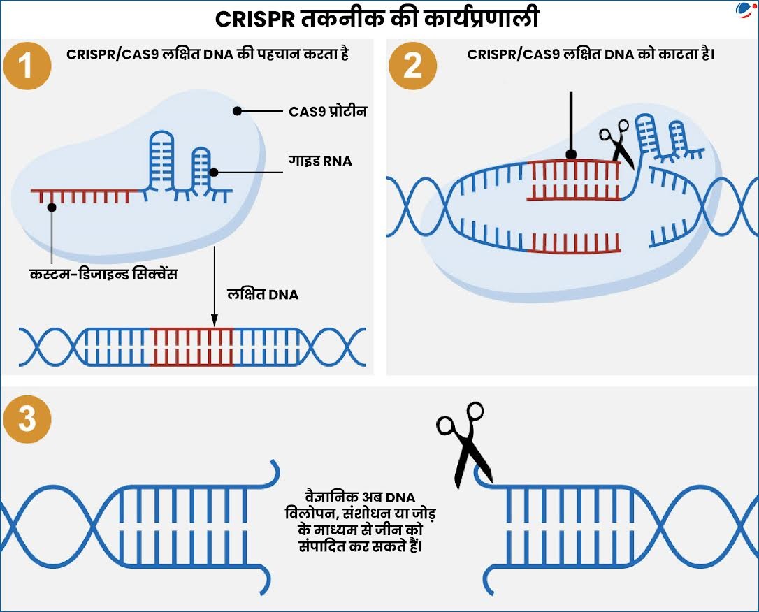 - यह जीवित जीवों के डीएनए (DNA) को चयनात्मक रूप से संशोधित करने वाली एक जीन-संपादन तकनीक है।