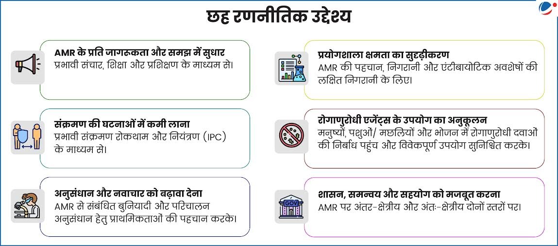 - विजन: विभिन्न क्षेत्रकों को शामिल करने वाले साक्ष्य-आधारित 'वन हेल्थ' दृष्टिकोण के माध्यम से AMR के उद्भव और प्रसार को रोककर मनुष्यों, जानवरों, पादपों एवं पर्यावरण के लिए एक सतत पारिस्थितिकी तंत्र का निर्माण करना।