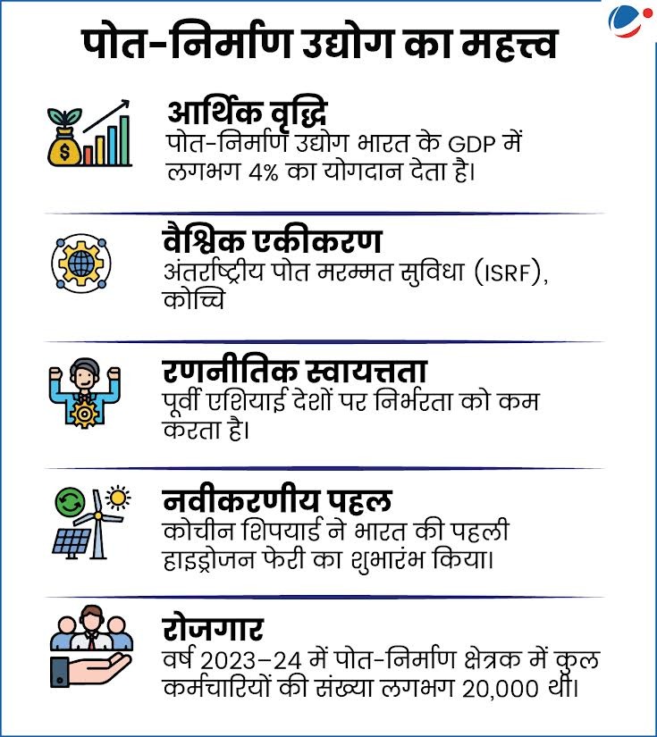 - वैश्विक स्थिति: भारत की वर्तमान में वैश्विक पोत निर्माण बाजार में हिस्सेदारी 1% से भी कम है। यह चीन (47%), दक्षिण कोरिया (25%) और जापान (18%) जैसे देशों से काफी पीछे है।