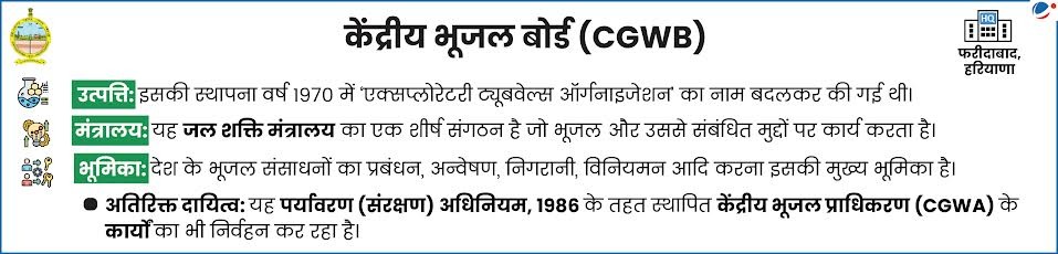 - उदाहरण के लिए: CGWB के अनुसार राजस्थान, पंजाब, हरियाणा और दिल्ली में भौमजल का दोहन 100% से अधिक है।