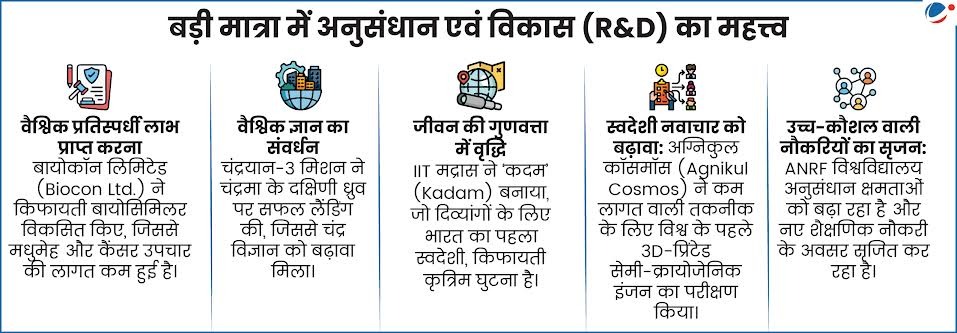 अनुसंधान एवं विकास (R&D) आर्थिक विकास, प्रौद्योगिकीय आत्मनिर्भरता (आत्मनिर्भर भारत) और वैश्विक प्रतिस्पर्धात्मकता के लिए एक उत्प्रेरक है। भारत को 5 ट्रिलियन डॉलर की अर्थव्यवस्था और अंततः एक विकसित राष्ट्र (विकसित भारत @2047) बनाने हेतु एक सुदृढ़ R&D पारितंत्र अनिवार्य है।