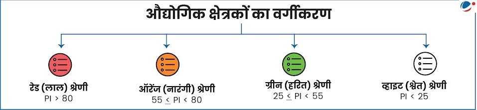 - CPCB ने प्रदूषण सूचकांक (Pollution Index - PI) के आधार पर उद्योगों को वर्गीकृत का एक तरीका विकसित किया है। यह 'एहतियाती सिद्धांत' (Precautionary Principle) पर आधारित है।