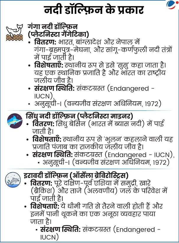 - अन्य: डॉल्फिन परियोजना संचालन समिति का पुनर्गठन किया गया है; डॉल्फिन और व्हेलिंग कमिश्नरों की नियुक्ति की गई है; गंगा नदी डॉल्फिन की सैटेलाइट टैगिंग की जा रही है आदि।