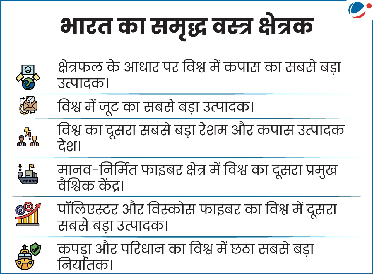 - निर्यात: वस्त्र एवं परिधान के मामले में विश्व का छठा सबसे बड़ा निर्यातक है।
