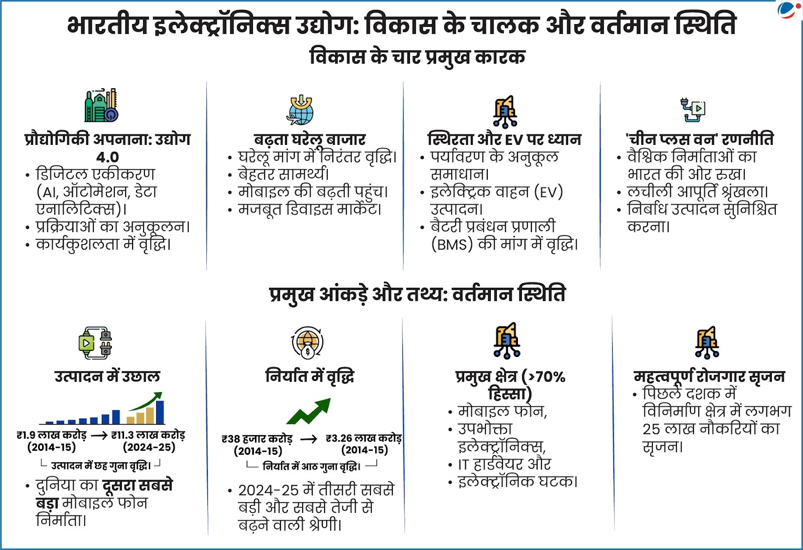- स्वदेशी अनुसंधान एवं विकास (R&D) की कमी: भारत का इलेक्ट्रॉनिक क्षेत्र मुख्यतः असेंबली आधारित है, डिजाइन आधारित नहीं।