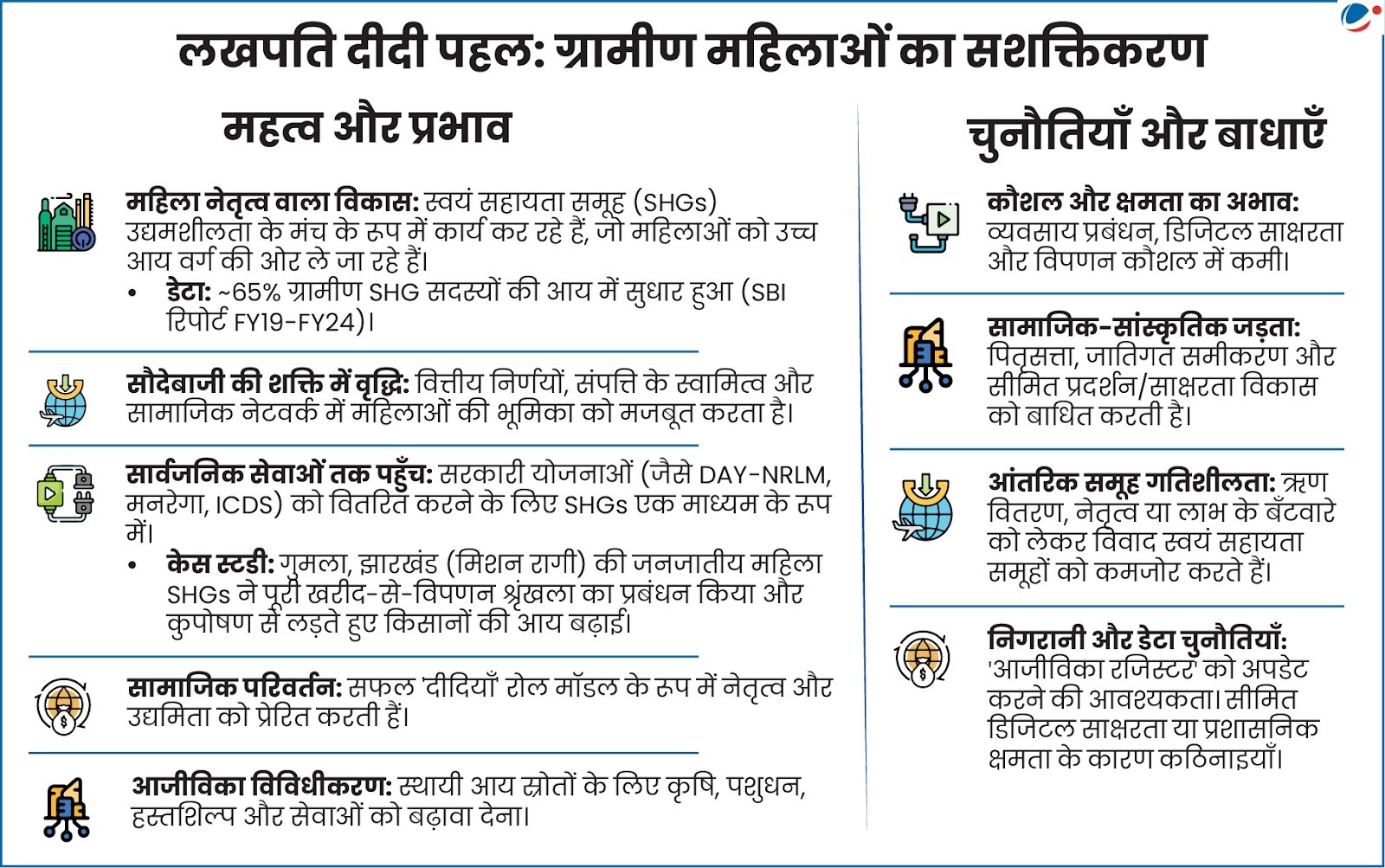 - क्षेत्रीय फोकस : पिछड़े और वामपंथी उग्रवाद (LWE) प्रभावित जिलों में महिला SHG को बढ़ावा देने जैसी लक्षित पहलों पर ध्यान देना।