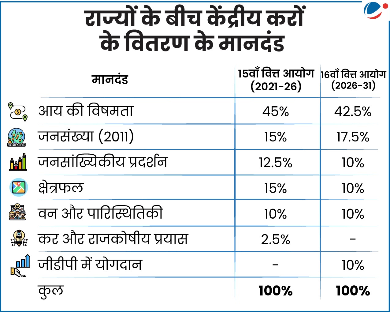 - जनसांख्यिकीय प्रदर्शन: अब यह 1971-2011 के बीच जनसंख्या वृद्धि पर आधारित है। इसने 15वें वित्त आयोग के 'कुल प्रजनन दर' (TFR) वाले मानक की जगह ली है।