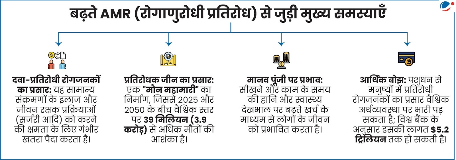- भारत में स्थिति: भारत में प्रतिवर्ष प्रतिरोधी संक्रमणों के कारण लगभग 6 लाख लोगों की मृत्यु हो जाती है।